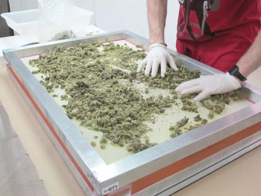 - Sacar los cogollos y restos de manicura del congelador y colocarlos sobre las mallas. Desmenuzar y remover con las manos, intentando no destruir demasiado y así evitar que se cuelen impurezas por las mallas.