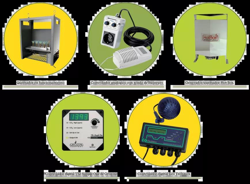Hay varios sistemas para aumentar la concentración de CO2 de un indoor. Se puede comprar CO2 embotellado y liberarlo en el cuarto de cultivo, o bien producirlo con uno de los siguientes sistemas: quemando combustibles fósiles, fermentando azúcares por medio de levaduras, descomponiendo materia orgánica con hongos o a través de procesos químicos como combinar bicarbonato y vinagre. De todos estos sistemas, las botellas de CO2 y los quemadores de gas son los más efectivos y los que permiten mantener una concentración preestablecida por medio de un regulador. Las botellas son muy adecuadas para indoors pequeños, mientras que los quemadores resultan ideales en cuartos grandes con varias luces, ya que permiten generar tanto CO2 como haga falta y se alimentan con bombonas de butano o propano, mucho más fáciles de conseguir que las de CO2. El inconveniente de los quemadores es que suponen un riesgo, ya que tienen llama y podrían provocar un incendio. Por otro lado, al quemar gas se produce calor y humedad además del CO2, lo que requiere mayor refrigeración y deshumidificación. Por último, el conjunto de quemador y controlador resulta bastante caro; puede llegar a superar los 1.000 euros, una cantidad excesiva para casi todos los pequeños cultivadores domésticos.