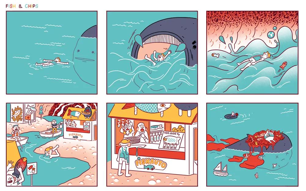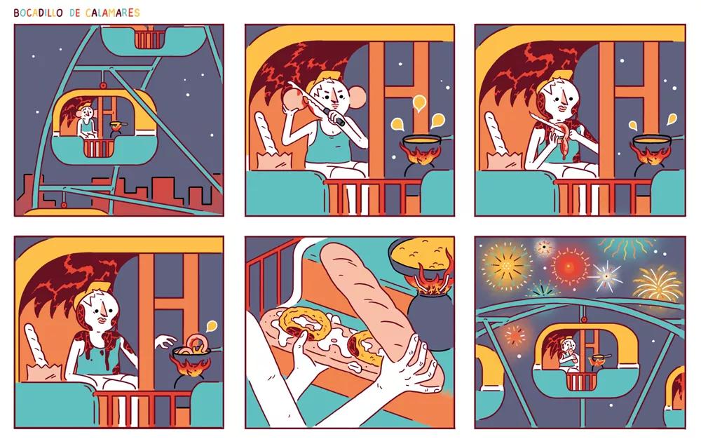El estilo y la elección de la paleta de colores responde a que quería trabajar un estilo preciosista, mono, así como redondito, para crear un contraste agridulce entre lo que se narra y el tono en que se cuenta. Este libro bebe de mil referentes, pero uno muy identificable para mí sería el cine gore de serie B. Un estilo cinematográfico en el que la violencia y la brutalidad son llevadas a tal extremo, que termina por carecer de realismo para convertirse en algo más bien ridículo y cómico. También me influyó mucho (o me traumó para bien) ver Pesadilla en Elm Street con cinco años. En este libro hay bastante de autobiográfico, y aunque conservo todos los dedos, muchas de las recetas que se narran en el cómic son pensamientos que he tenido en situaciones “parecidas” a las representadas. Y aunque no llegué nunca a ejecutar ninguna de esas recetas, gracias al marco que nos ofrece la ficción pude llevarlo a cabo en dibujos. Pero, tiempo al tiempo, no descarto freírme un dedo en tempura algún día.