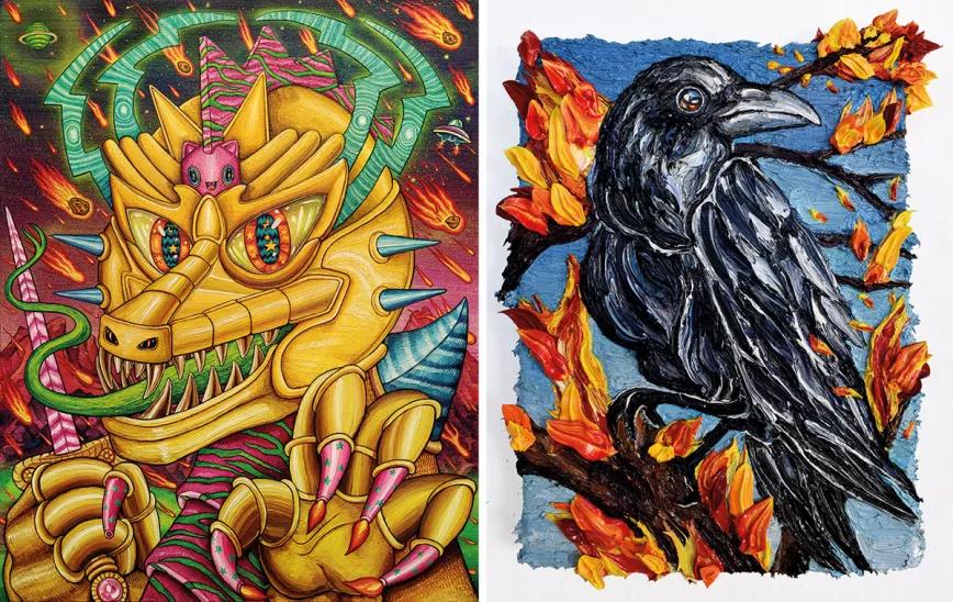 Totally Enormous Extinct Dinosaur, óleo y spray sobre lienzo, 161 x 130 cm. (2022); y Cuervo en el incendio, óleo sobre lienzo, 22 x 16 cm. (2021).