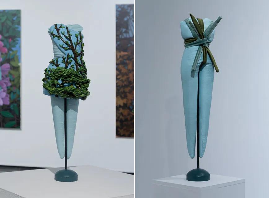 Forest mannequin, tela, pasta polimética, esmalte, resina y piedra cerámica, 75x30x30 cm (2023) y Velvet creeper mannequin, tela, terciopelo y piedra cerámica, 75x20x20 cm (2023).