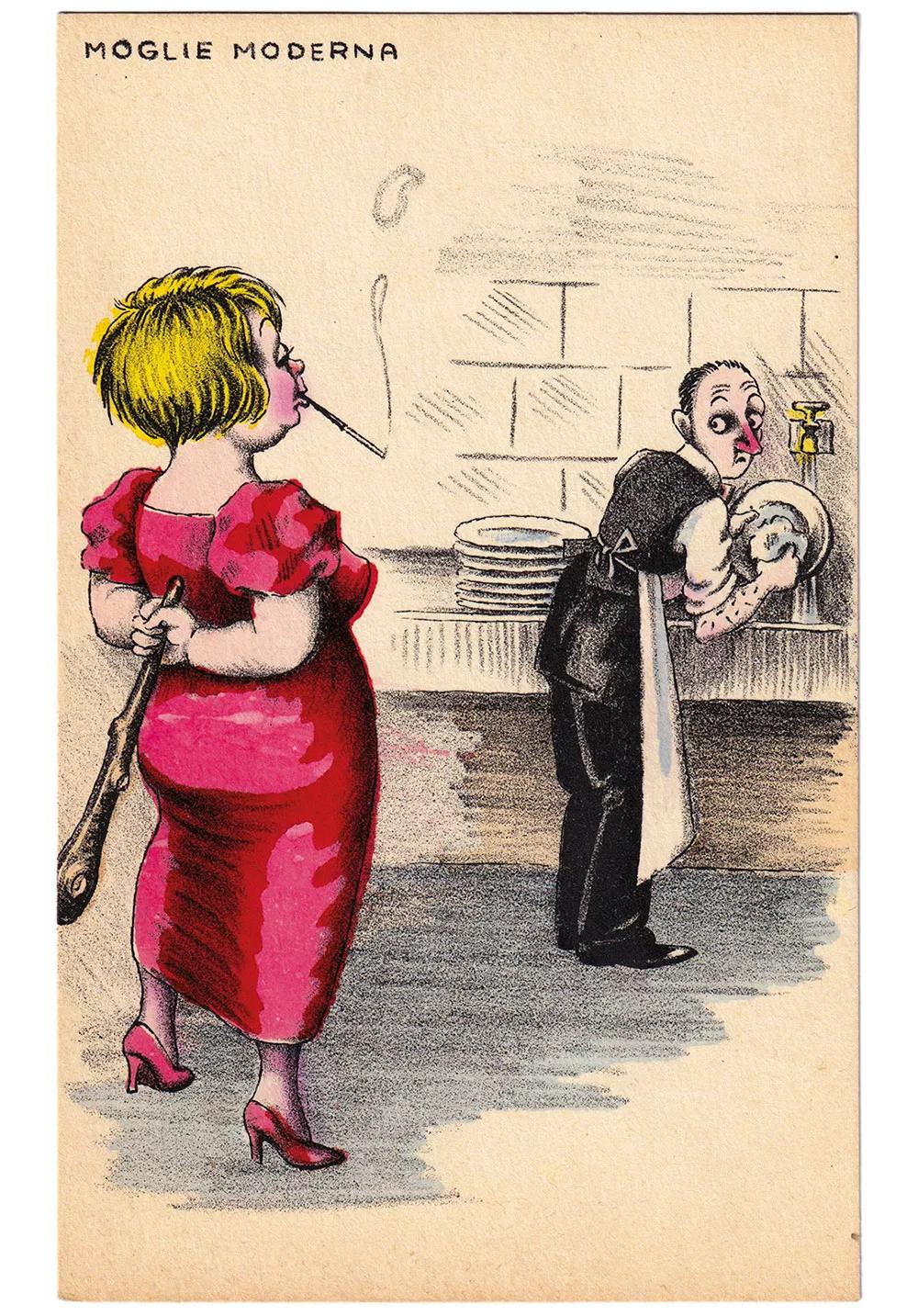 Y luego está la infinidad de chistes sobre la terrible y patética solterona, un tropo inventado para dirigir a las mujeres hacia el amor, la abnegación y las labores reproductivas, de crianza y cuidados, siempre dentro del espacio privado. Un mito que disuade e impide concebir alternativa: “La mujer que al amor no se asoma no merece llamarse mujer”, dice la canción. Y es interesante ver cómo los temas que tocan estas postales tienen siempre su reflejo en el refranero: “Mujer sin varón, ojal sin botón”, “La mujer que no se casa se seca como una pasa”, “Soltera que pasa de treinta, de rabia revienta” o “Por ese hablar tan suelto, habrás de perder casamiento”.