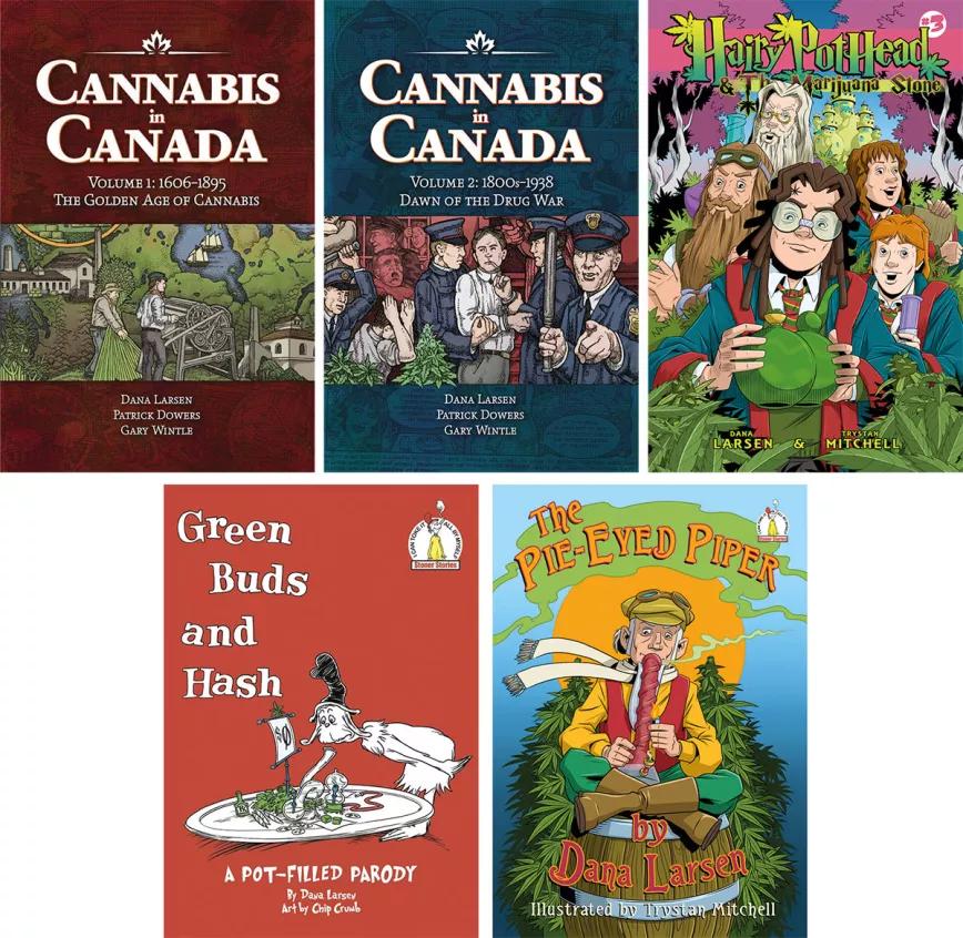 Portadas de algunos de los libros escritos por Larsen: una historia del cannabis en Canadá; Green Buds and Hash, un poema paródico que es su gran bestseller y los cómics de Hairy Pothead.