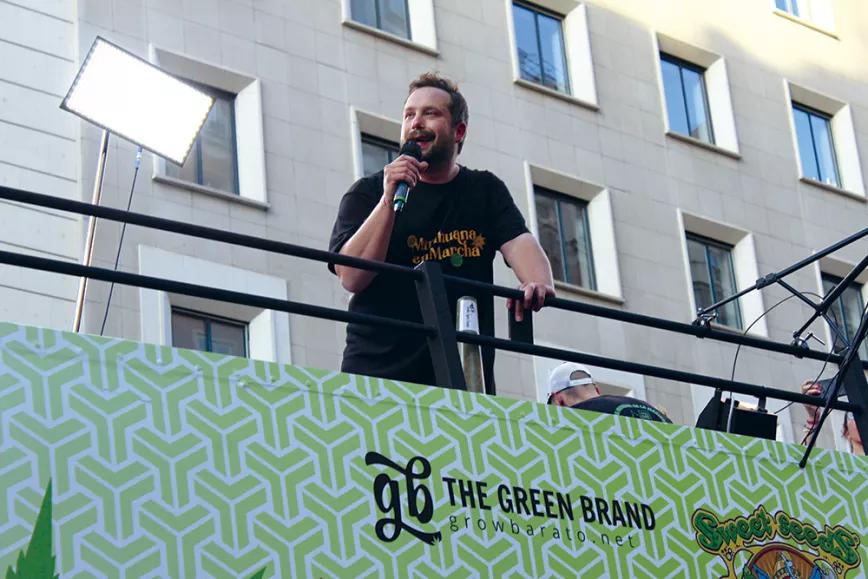 Desde el autobús descapotable, Afuera se dirige a los manifestantes de la Marcha Mundial de la Marihuana en Madrid (2022).