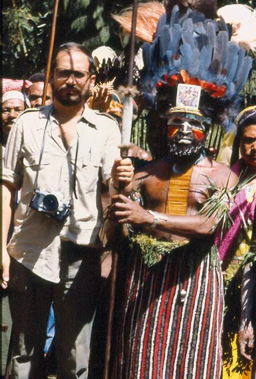 Pérez posa junto a un indígena en una expedición antropológica en la Melanesia.