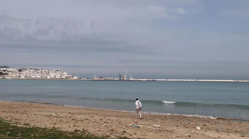 Un hombre pasea por la playa con el puerto de la ciudad al fondo.