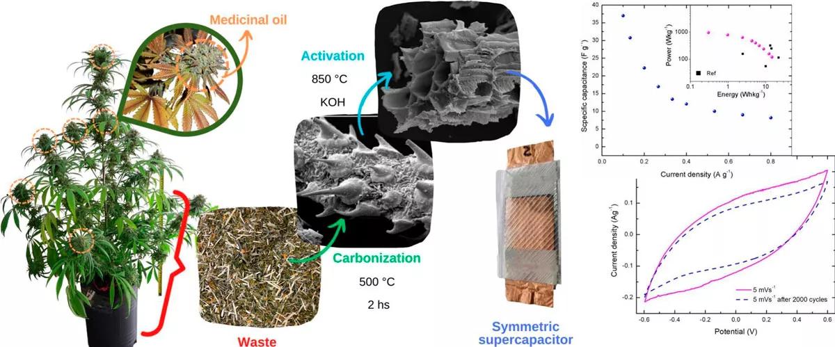 Un grupo de investigadoras del CONICET, la principal institución científica de Argentina, desarrolló un modelo de supercapacitador a base de residuos de cáñamo. Se trata de un almacenador de energía de alta potencia que se utiliza como complemento en las baterías de celulares, automóviles y computadoras. “Los materiales tienen adentro materiales que brindan energía porque entre ellos ocurre una reacción química. Es decir, los materiales se van degradando y en esa degradación de componentes se genera energía”, dijo Florencia Jerez, integrante del proyecto, en diálogo con el medio THC.