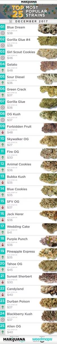 Marijuana publica la última lista de preferidos del 2017. Un mes antes de que se legalice la recreacional en California las cosas se mantienen más o menos en su sitio: Blue Dream, Gorilla Glue #4 y Girl Scout Cookies siguen copando el top 3.