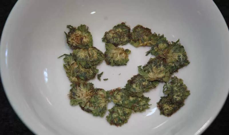 Cannabis: Los cogollos que hay que emplear para hacer Rosin deben ser pequeños, para que el calor de la plancha sea capaz de licuar toda la resina en pocos segundos. El tamaño de la plancha, sobre todo su anchura, determinará el tamaño máximo de cogollo que se puede emplear, pero, en general, sirven los que tienen una talla de entre uno y dos centímetros de diámetro. Si el material disponible está formado por cogollos más grandes, hay que dividirlos en trozos más pequeños.